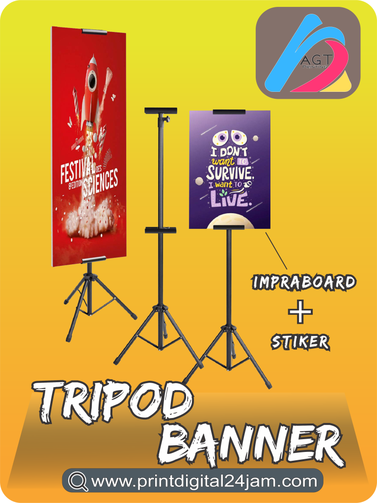 Standing Tripod banner, Stiker meteran, Albatros,One way, Duratrans, Backdrop acara, Polyfoam, Impraboard, dan digital printing lainnya.